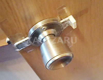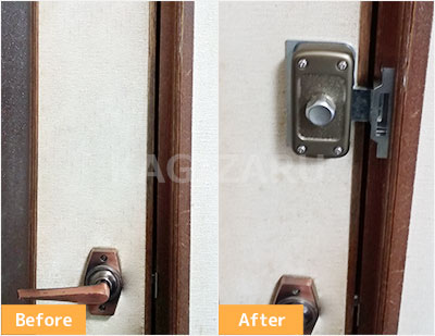ご希望は、在室時のみ外から開けられないようにとのこと。そのため、外側に鍵穴がなく室内からのみ施錠ができる内締まり錠をご提案しました。部品は、GOALのMD-3です。